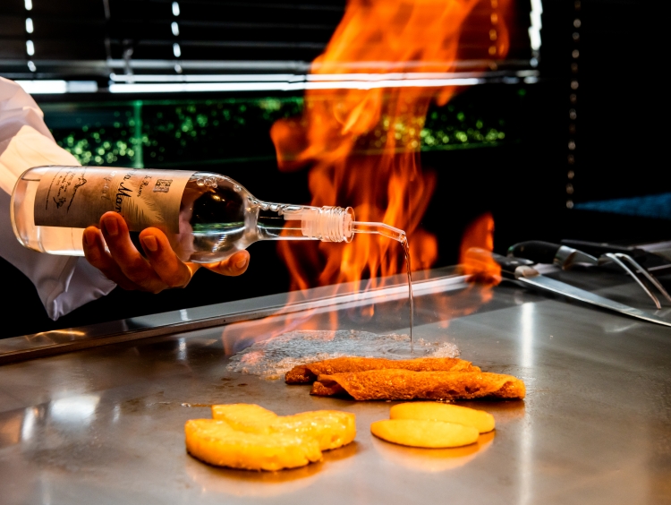 一面の窓からの景色を背景に、目の前で繰り広げられるシェフの匠な技。景色のみならず、ジューシーな音や香りも楽しんでください。